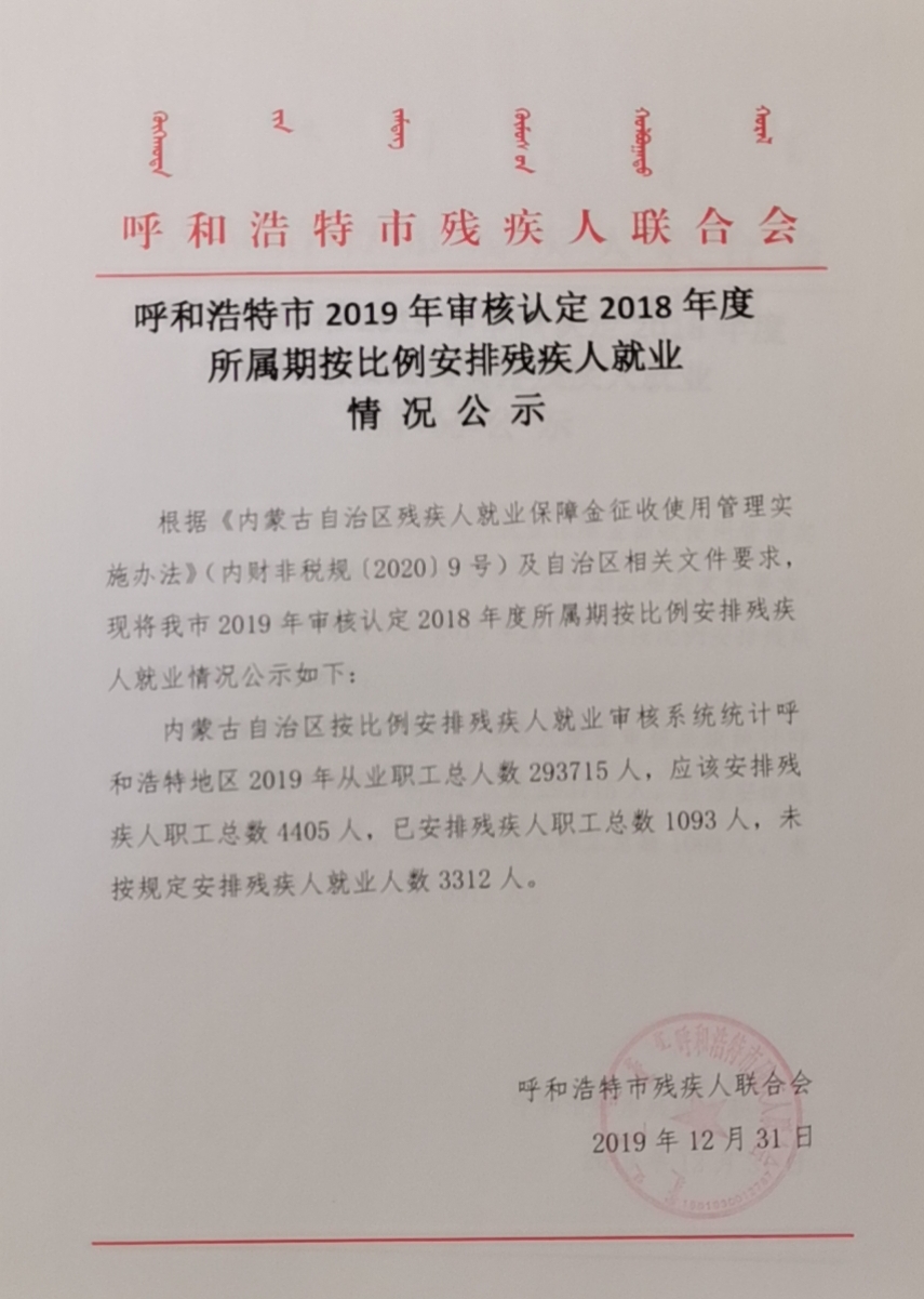 呼和浩特市2019年审核认定2018年度所属期按比例安排残疾人就业情况公示