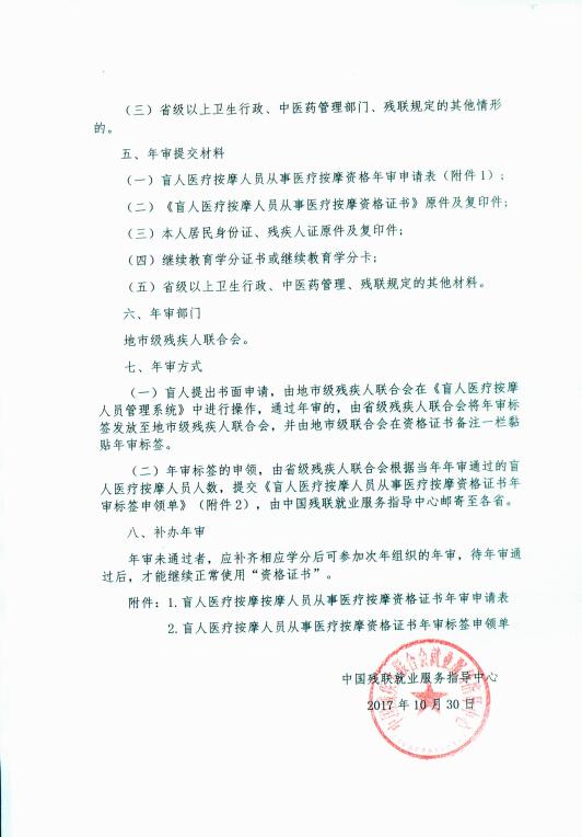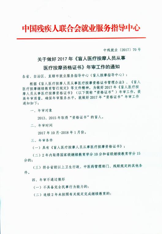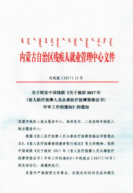 关于转发中国残联《关于做好2017年〈盲人医疗按摩人员从事医疗按摩资格证书〉年审工作的通知》的通知(内残就〔2017〕12号)